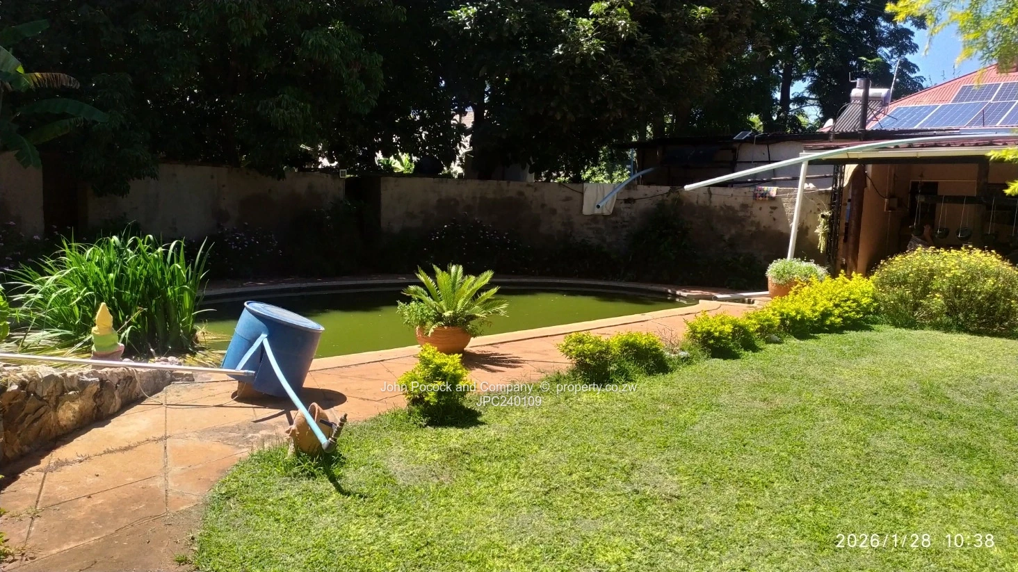 Mature trees and a swimming pool converted into a pond create a calm, green backdrop, supported by a borehole. Additional improvements include staff accommodation, and solar geyser with electric fencing and gated access.